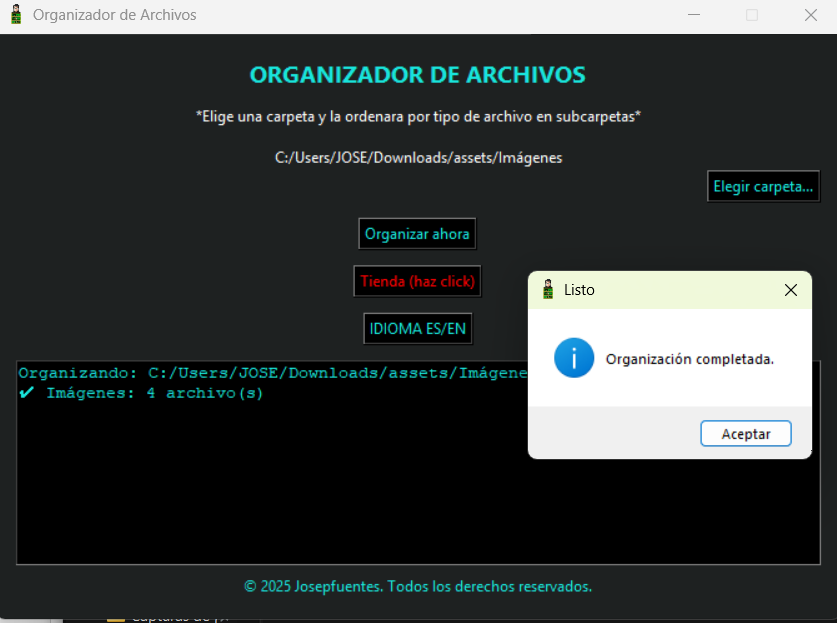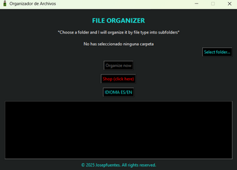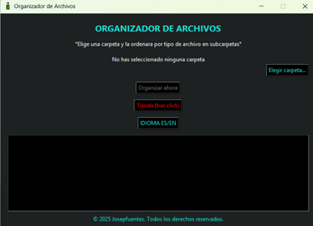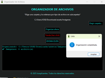El Organizador Básico de Archivos es una herramienta sencilla y práctica diseñada para ayudarte a ordenar automáticamente tus archivos por tipo. Ideal para organizar carpetas desordenadas o gestionar grandes conjuntos de documentos.